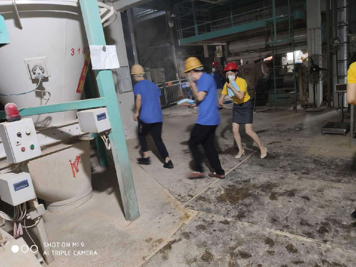 11:00,警报拉响(xiǎng),车间粉尘滚滚,生产人员头戴安全帽,佩戴(dài)防尘口(kǒu)罩,手(shǒu)捂湿毛巾,有序(xù)的在现场负责人的指挥下离开危险区域。