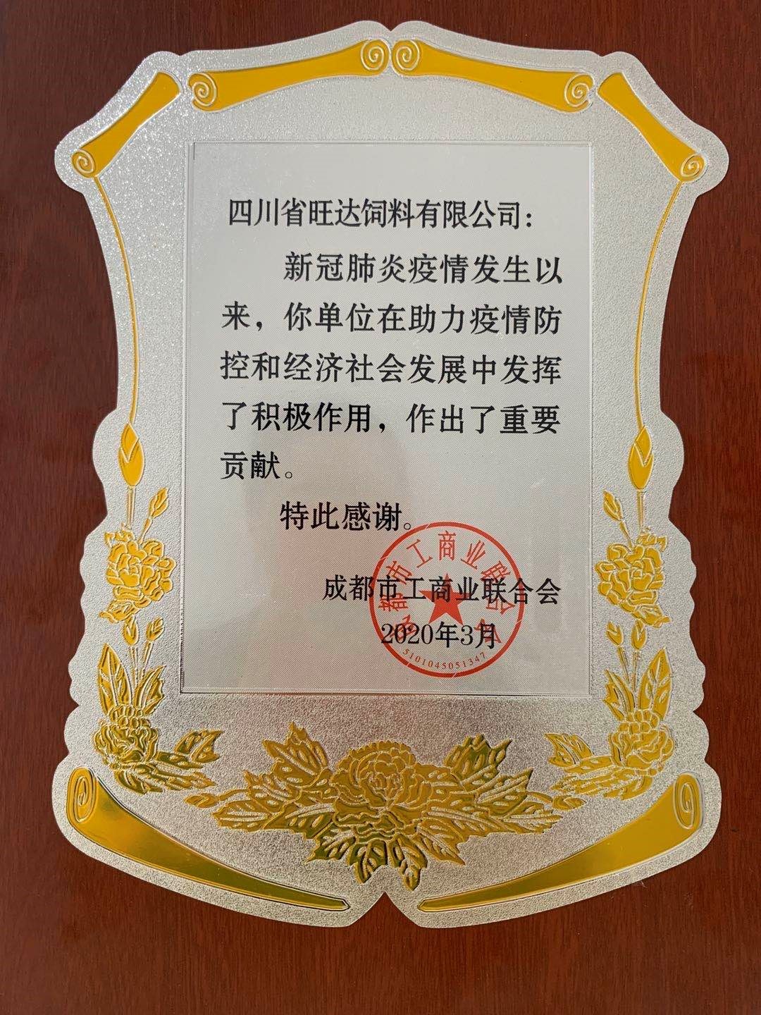 成都市工商(shāng)联授予四川(chuān)旺达防疫优秀企业