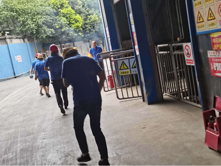 11:00,警报拉响(xiǎng),车间粉尘滚滚,生产人员头戴安全帽,佩戴(dài)防尘口(kǒu)罩,手(shǒu)捂湿毛巾,有序(xù)的在现场负责人的指挥下离开危险区域。